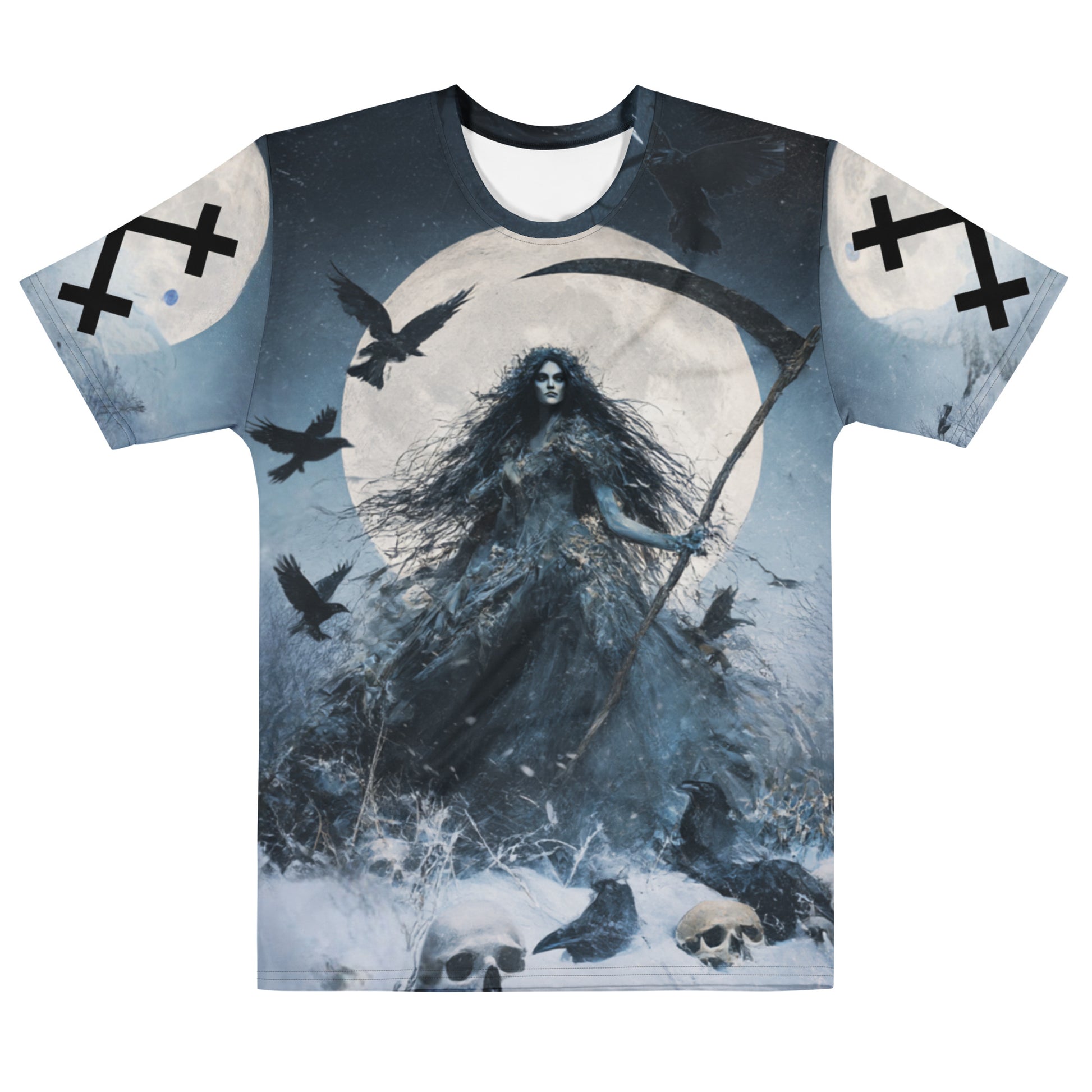 Embrace the darker side of Slavic folklore with this Morana all-over print t-shirt for men. Known as the goddess of winter, death, and rebirth, Morana is a powerful symbol of seasonal change and transformation in ancient Slavic mythology.