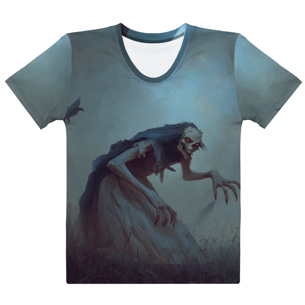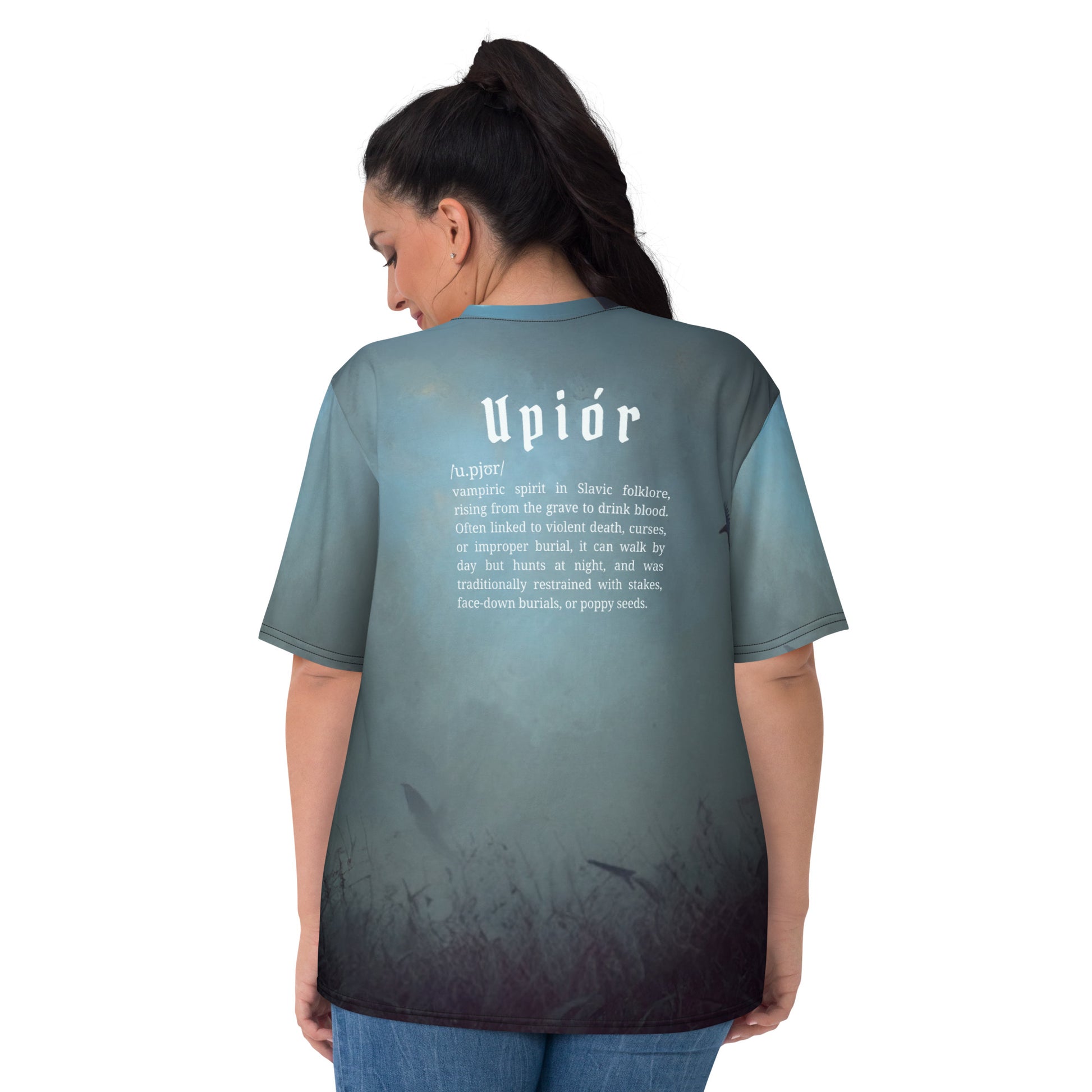 Bring the dark allure of Eastern European legend into your wardrobe with this Upiór women’s all-over print t-shirt. In Slavic folklore, the Upiór is a vampiric spirit trapped between life and death, feared for its thirst for blood and restless soul.
